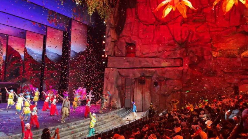 当《秘境神农架》演出步入尾声时,现场氛围热烈非凡。演员们带领全场游客跳起热门网络热舞,整齐的舞步、欢快的节奏嗨翻剧院;巨型气球缓缓升空,游客们伸手触碰、合影留念,童趣与年味交织,将现场狂欢推向顶点。