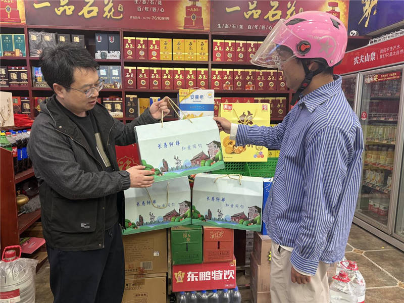 在协助零售户提升店面形象的同时,服务队还推动设计了“长寿”礼盒,可以将葛粉、米茶、石牌豆腐皮等富硒特产随机进行组合销售。礼盒外包装以钟祥旅游景点为底,印有“长寿钟祥 知音同行”字样。零售户江涛笑着说:“客人进店看到这个礼盒,都说包装讲究、拿得出手。”通过这些细节,土特产不再仅仅是食品,更是可讲述、可分享的“寿乡名片”。